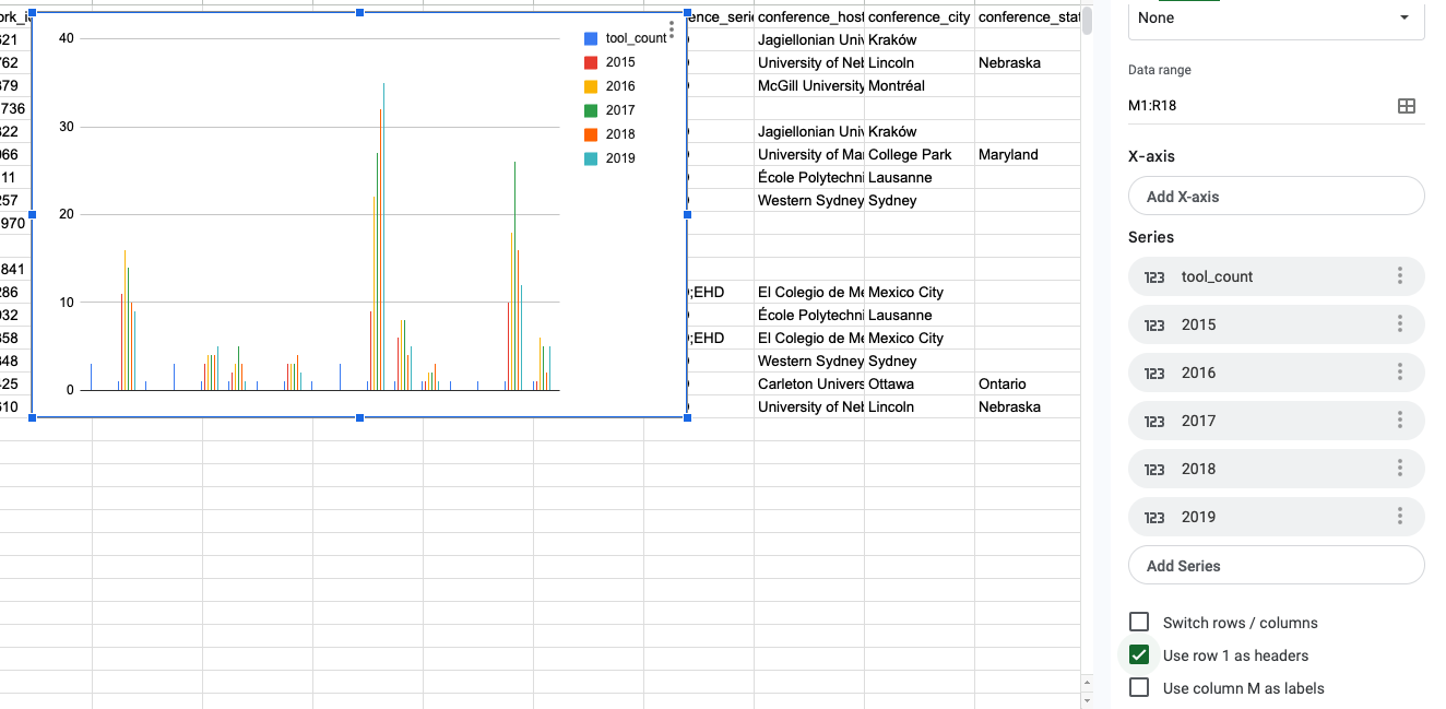 I would also encourage you to draw on our applied readings from this week to help guide your discussion. For example, knowing some of the diversity issues in DH conferences, how might that impact our visualization of this data? Or knowing that data visualization is often used to make arguments, how might that impact our visualization of this data?