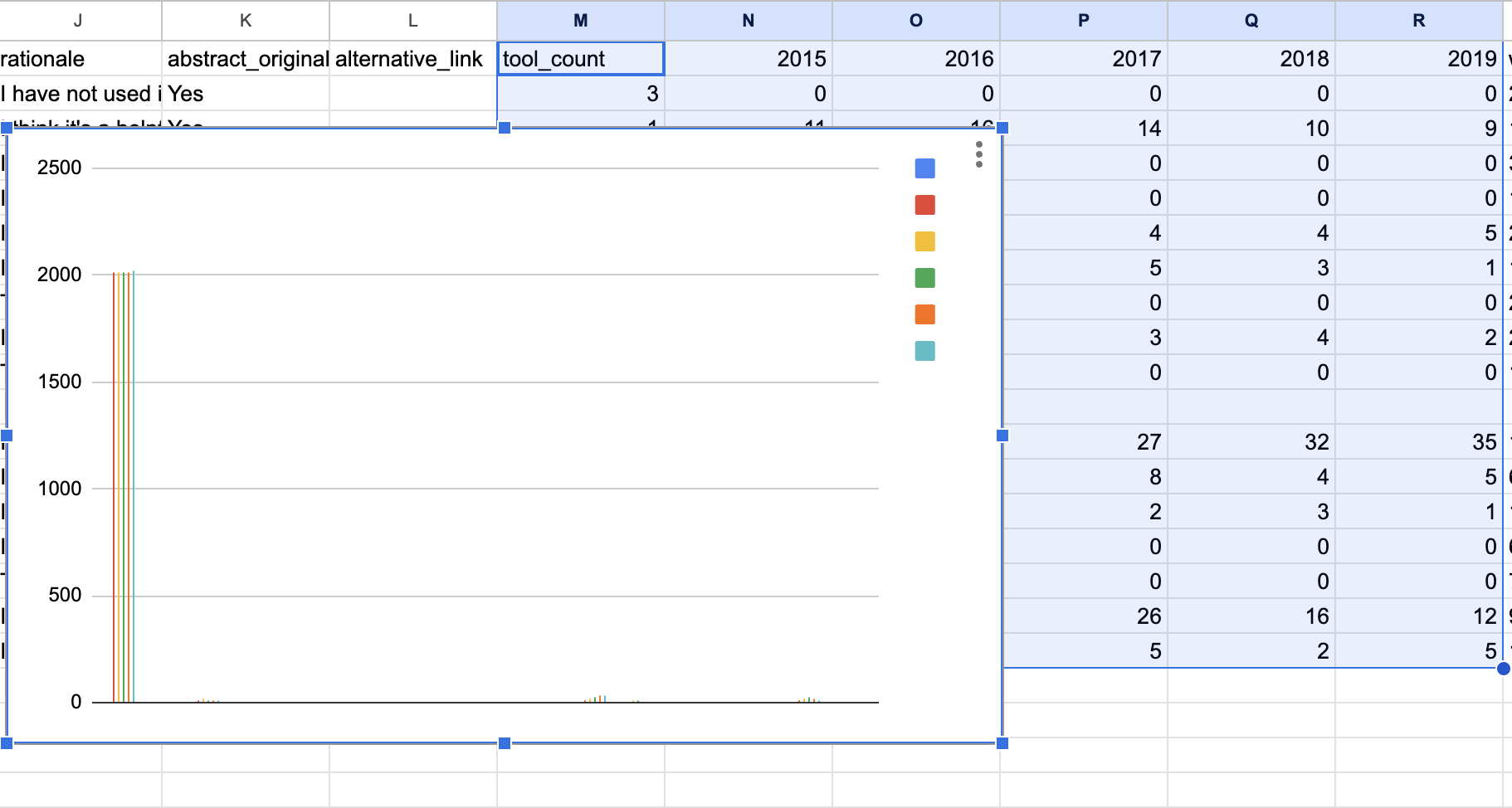 When thinking about how to answer this question we need to start thinking about how we would make this comparison. Intuitively, a counting approach stands out, particularly given that some of our columns already provide such counts (tool_count, along with the year-based data from the blog post).