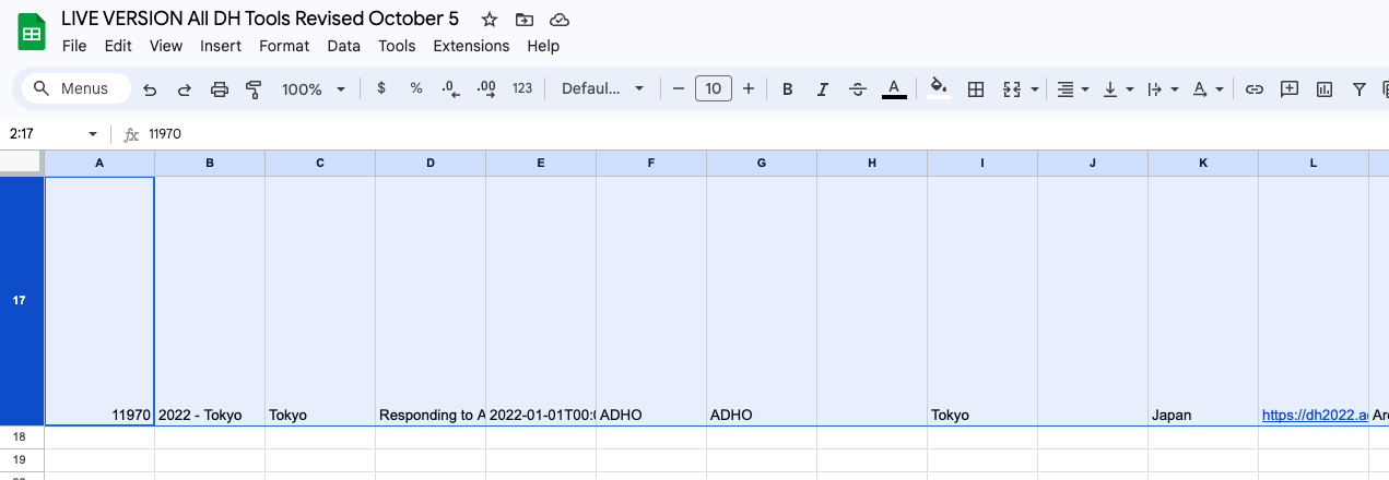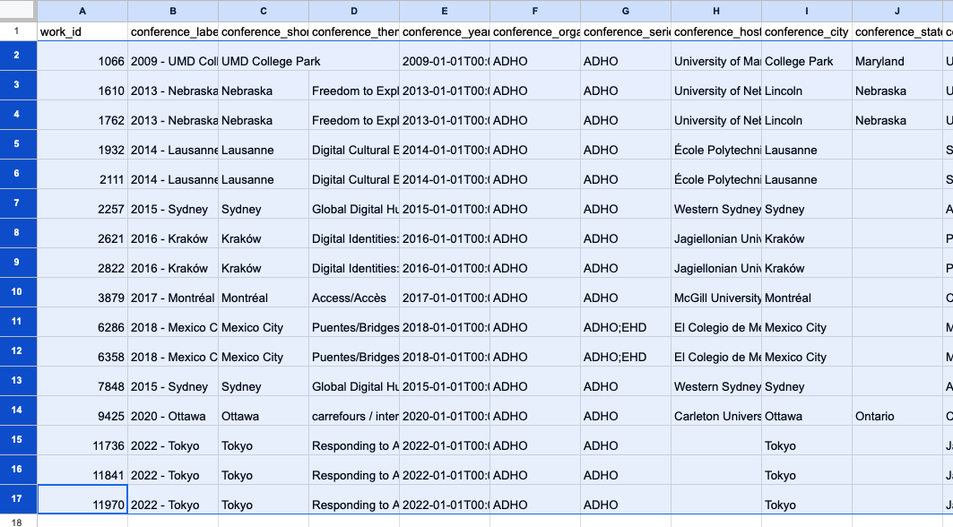 Upon importing, you should find a new sheet at the bottom, which you can name index-of-dh-abstracts if it isn’t already. You’ll also notice that the text size within each cell is considerably large, complicating data inspection.