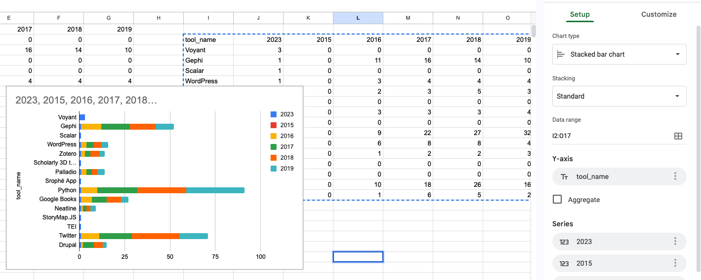 By stacking the chart, the popularity of the tools across datasets becomes more distinguishable. Particularly, Voyant emerges as a favorite in our class.