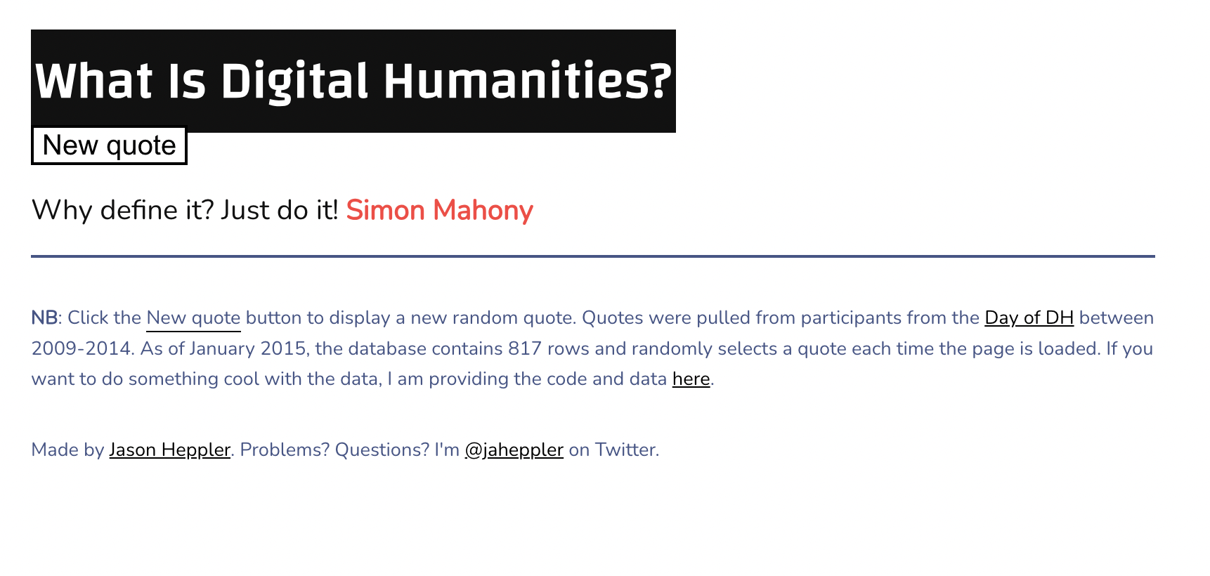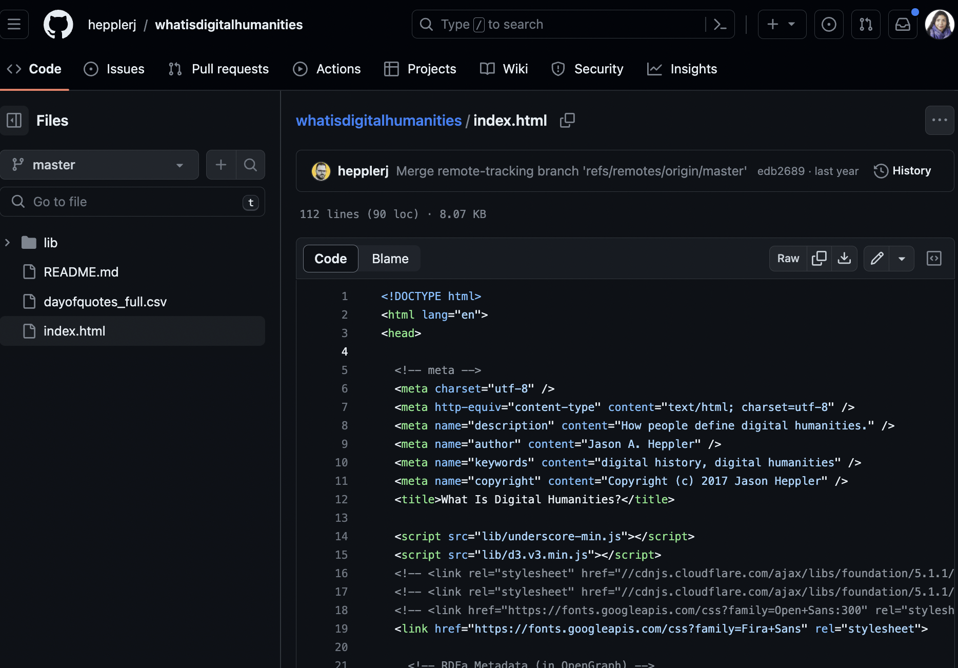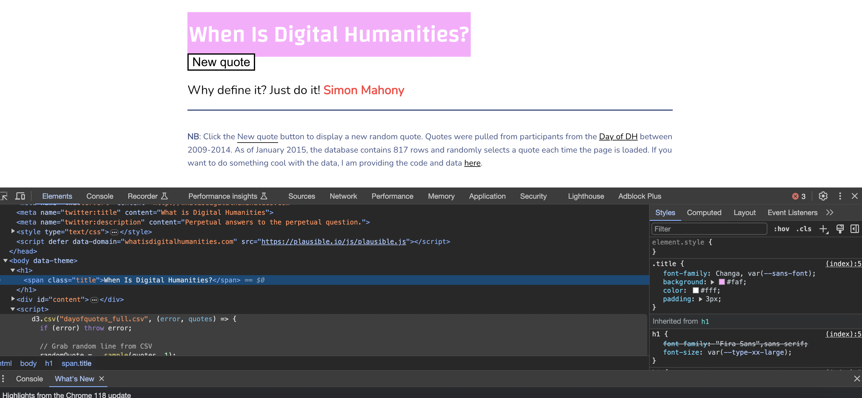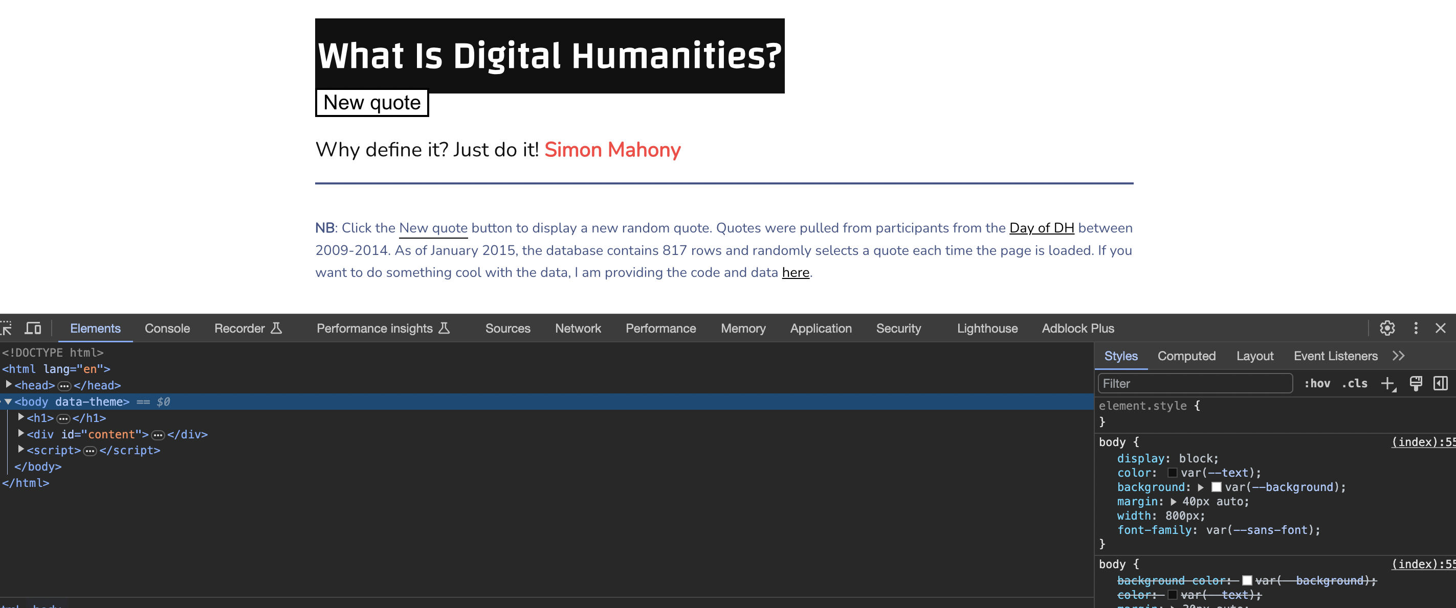 So far we’ve been either working with very simple HTML documents (like our example above) or very complex ones (like our Kepler.gl.html example). To find a middle ground, let’s return to our very first week and take a look at whatisdigitalhumanities.com.