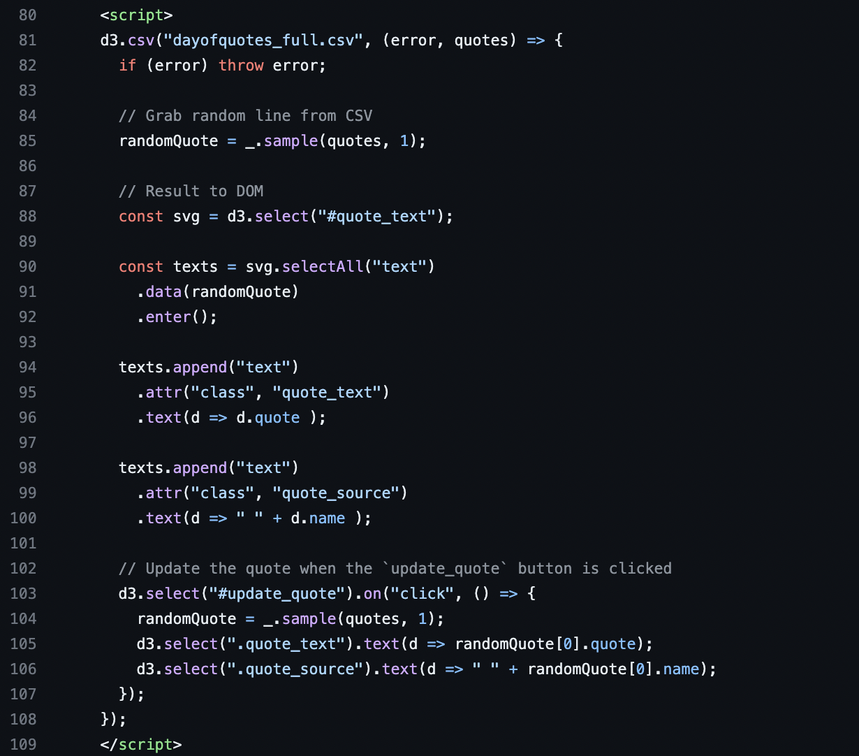 This part of the script selects an SVG element with the ID quote_text and binds the randomQuote data to text elements within that SVG. It then enters the data-join, which is a way of joining data to DOM elements. For each quote, it appends two text elements to the SVG: one for the quote text and one for the quote source (the person who said the quote). It sets the class for each text element so that they can be styled with CSS.