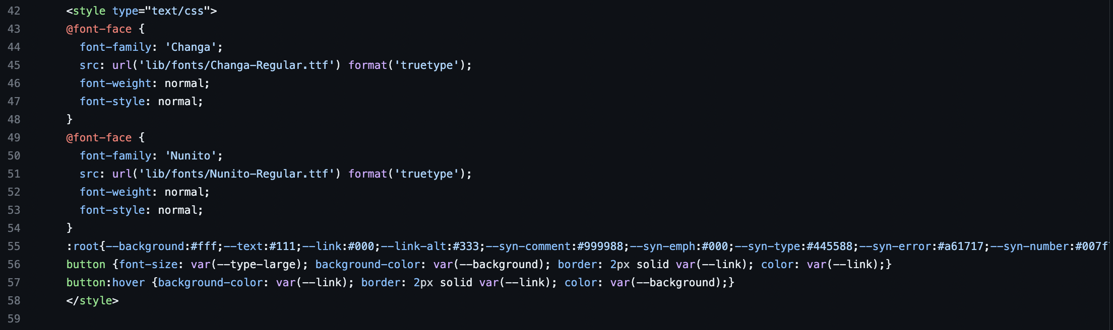 This selector targets elements with a data-theme attribute that has the value “dark”. It’s a way to apply a different set of styles when the dark theme is active. The variables defined here override the ones set in :root when the dark theme is applied.