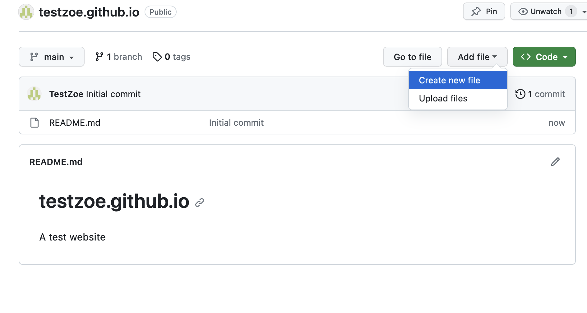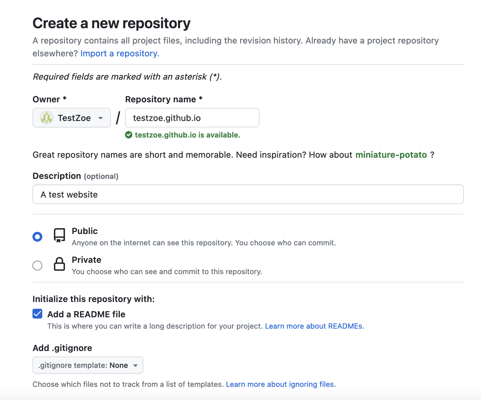 As a user on GitHub, you can create a custom website that is hosted on GitHub Pages. This is a great option for creating a personal website, or a website for a project. This website is hosted at the github.io domain name so you don’t have to pay for a domain name. However, to make this domain you need to create a repository with a specific name: your username. So for example, my GitHub username is ZoeLeBlanc so I need to create a repository called ZoeLeBlanc.github.io. However, to help demonstrate this functionality, I created a new a username called TestZoe, so my repository is called testzoe.github.io.