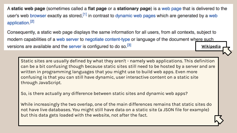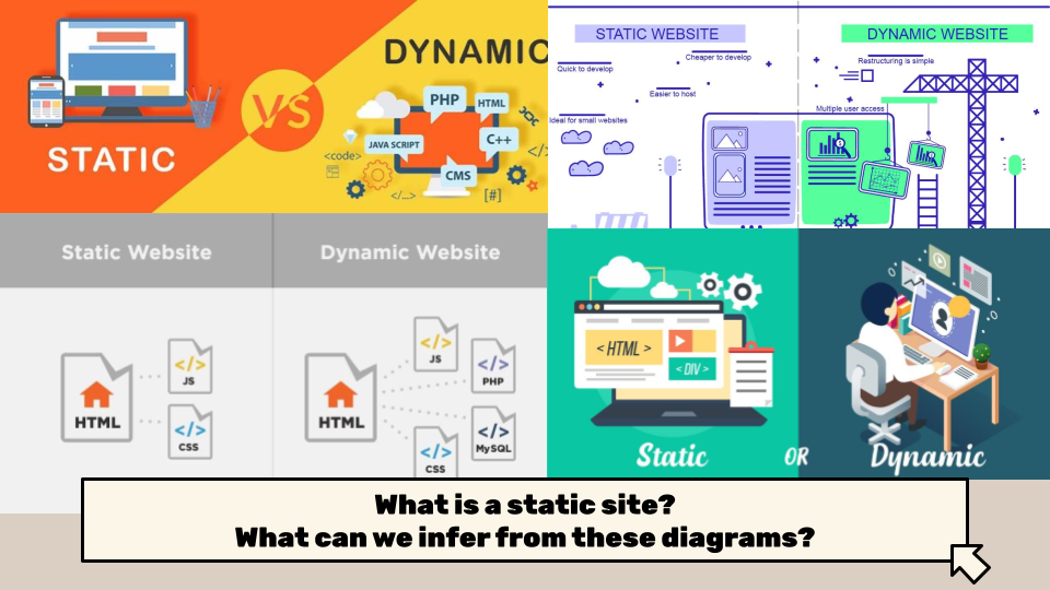 From these infographics, we can see some differences between dynamic and static, but to be honest this distinction is a bit more blurry than it might seem. For example, static sites still need to be hosted on a server, and they can still have dynamic elements (like a search bar or a comment section). But the core difference is that static sites don’t have a database, so you never need to have login credentials to access the site.