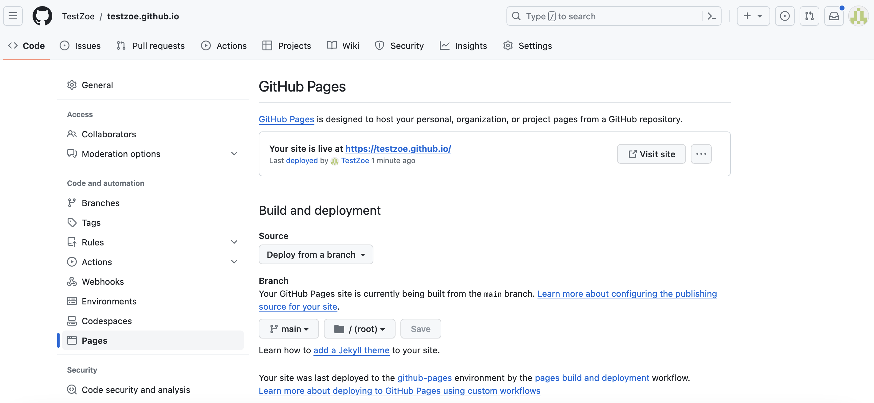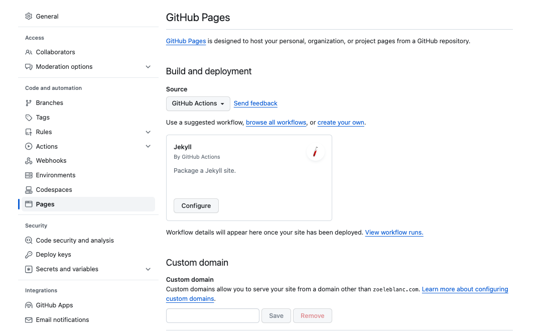 Once we have this all added, the final piece is to go into our settings and configure GitHub Pages to publish our website. You can do this by going to the Settings tab and then scrolling down to Pages: