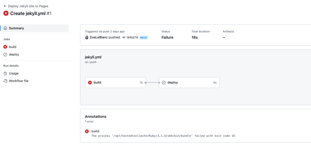 It means that GitHub failed to build your website. This error message is not super important to understand but to fix it you need to run the following line of code in your Terminal in the directory (aka folder) with your Jekyll site, which I learned from the following StackOverflow post (which is a very helpful forum for coding questions) https://stackoverflow.com/questions/72331753/ruby-and-rails-github-action-exit-code-16: