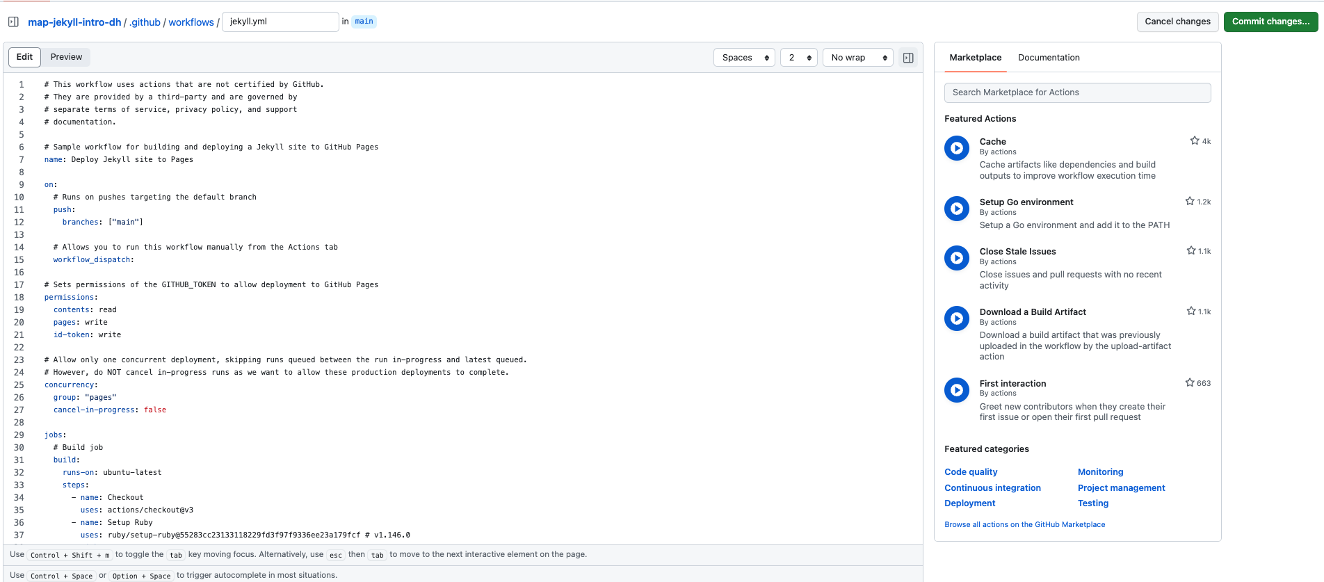 Then you need to commit and push your changes to GitHub (or use github.dev to replace the existing files). Once you do that, GitHub should start building your site correctly. If you get any other error message, please don’t hesitate to reach out to the instructor for help, and just remember that these types of issues though frustrating are not representative of your ability to do this work. In fact, an HCI professor wrote an excellent post about how this type of configuration errors can deter students (you can read a bit about that here https://www.kevinbrowne.ca/command-line-bullshittery-and-other-realities-of-computing/).