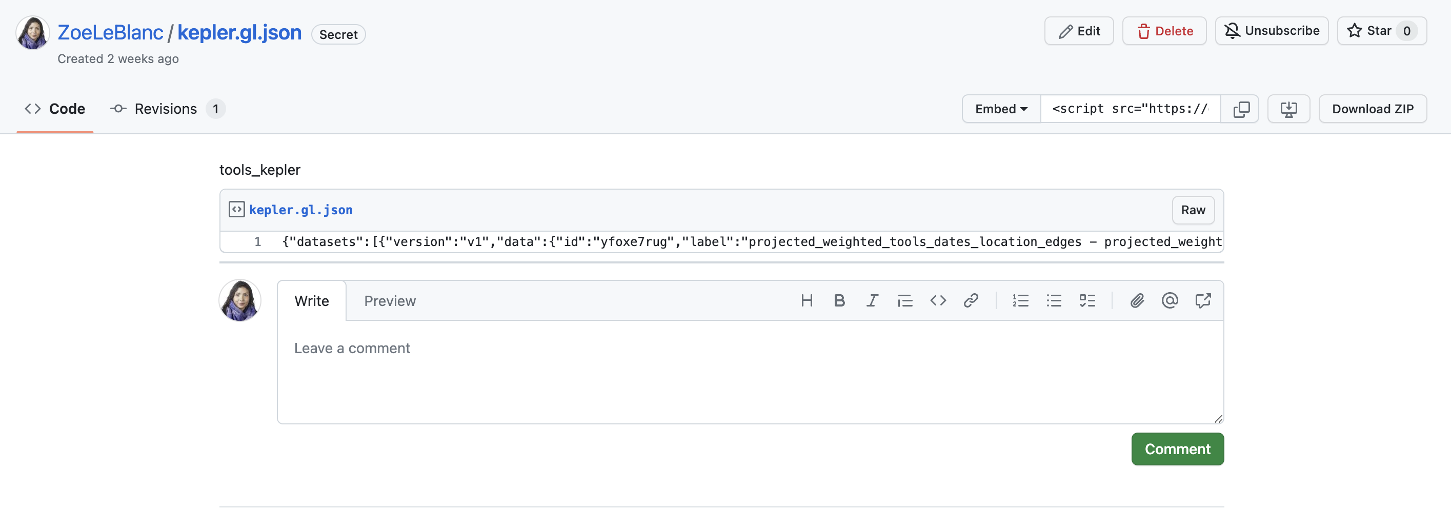Then, I simply copied the link to the gist (in this case https://gist.githubusercontent.com/ZoeLeBlanc/32daed91a4eb0038640891b95e78029c/raw/580a8252b3757387e0fc5ae309e88a3c921f9c06/kepler.gl.json) and pasted it into the following code: