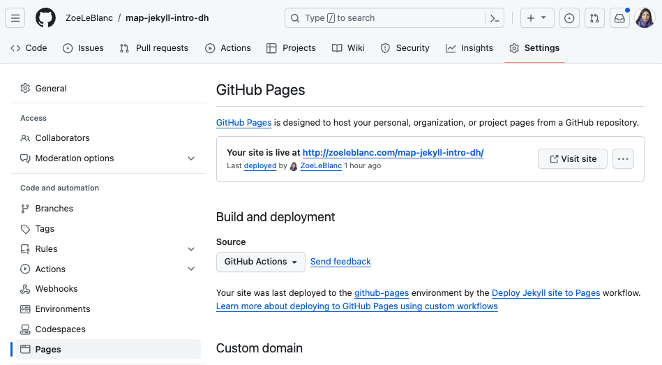 You can still see how GitHub is deploying your site by clicking on the tab called Actions:
