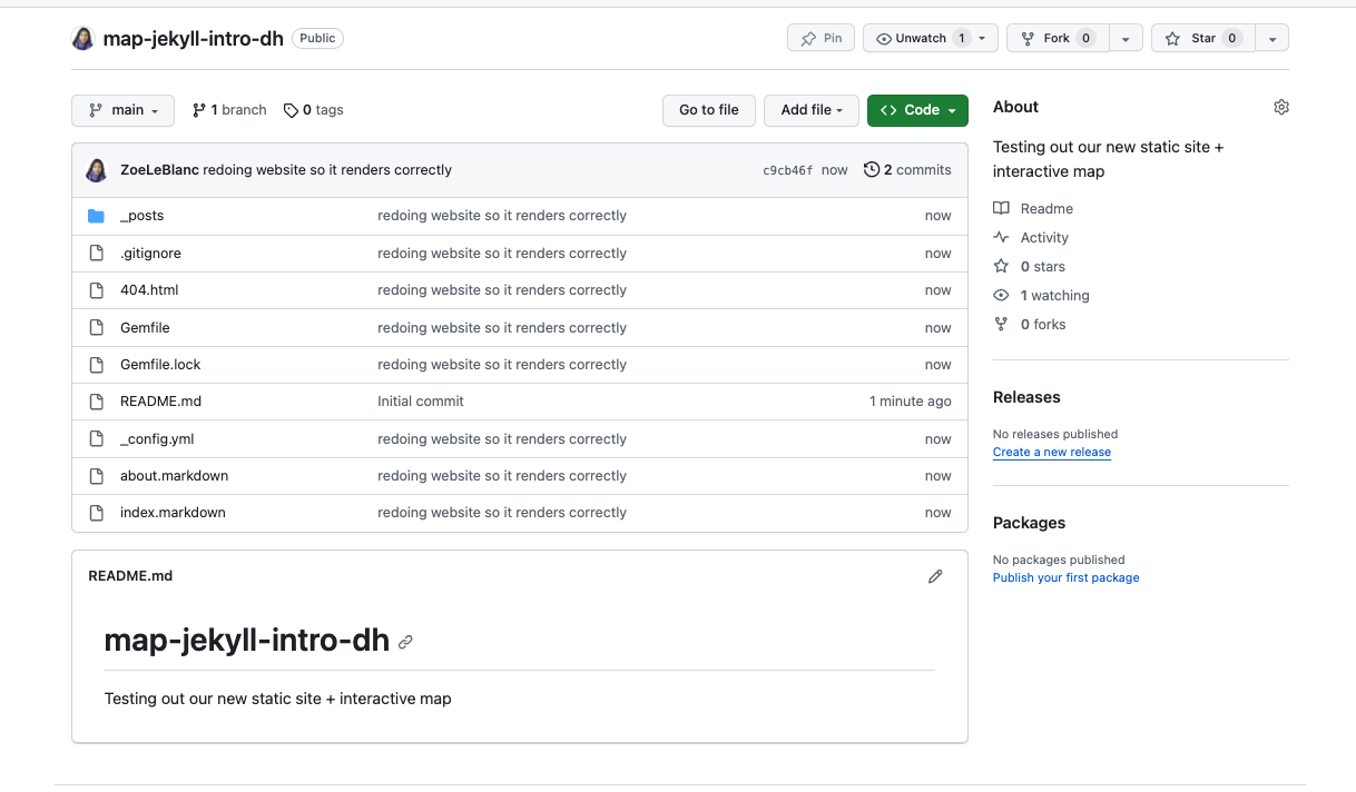 Now you can see all this code in my repository https://github.com/ZoeLeBlanc/map-jekyll-intro-dh and visit the website at http://zoeleblanc.com/map-jekyll-intro-dh/.